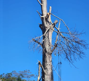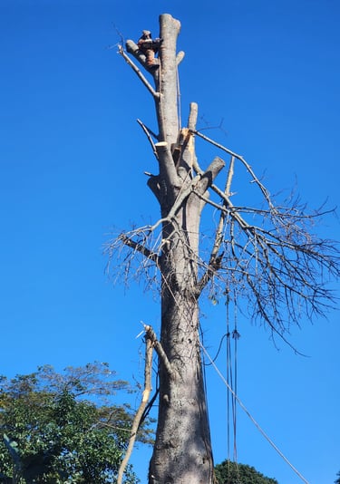 Safe dismantling of dangerous, dead, storm-damaged, or overgrown trees using controlled sectional techniques — especially in tight urban spaces across Randburg, Johannesburg, Gauteng.